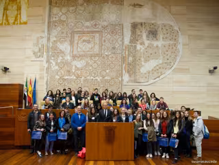 El grupo de alumnos está formado por 26 jóvenes extremeños del IES Emérita Augusta y 25 participantes procedentes de Alemania, Reino Unido y Turquía, quienes han visitado el Parlamento de Extremadura acompañados por seis profesores extranjeros y tres españoles.