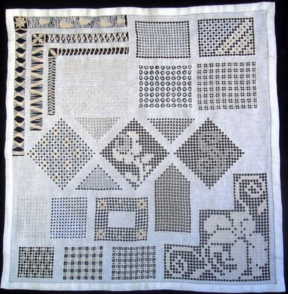 La muestra está formada por un total de quince dechados de lino bordados a mano en su mayoría con hilos de algodón basados en dos técnicas, una de hilos contados o de punto de cruz y otra de vainicas o deshilados.