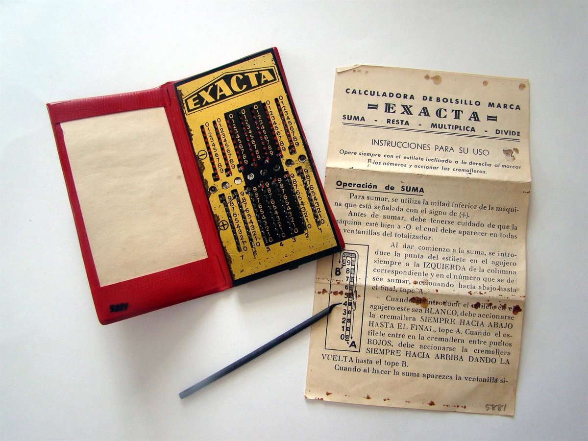 Esta calculadora de bolsillo, también llamada contóstilo o aritmógrafo, es una máquina manual, marca Exacta, de fabricación alemana, que permite realizar sumas, restas, multiplicaciones y divisiones, y que fue donada al museo por José Ramón Garrido en 1996.
