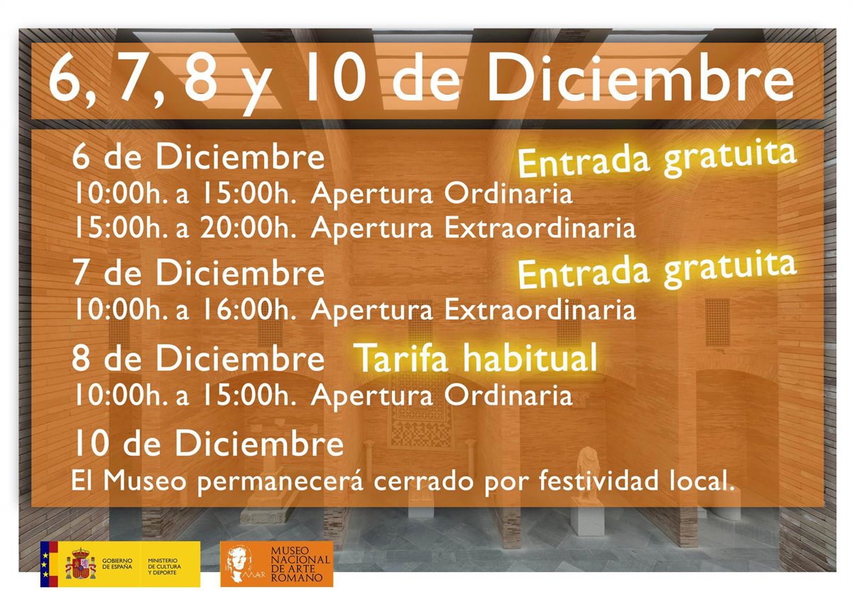 A su vez, el lunes día 7 el Museo Nacional de Arte Romano abrirá de forma gratuita de 10,00 a 16,00 horas; y el martes día 8 de 10,00 a 15,00 horas con la tarifa habitual de entrada.