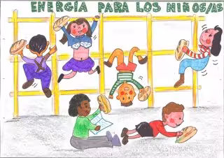 El dibujo de Lucía ha querido enseñar a los adultos la importancia que el pan tiene en nuestra alimentación. Con su postal titulada 'El pan, energía para los niños', esta pequeña pacense aboga por incluir un bocadillo en la merienda de los más pequeños.