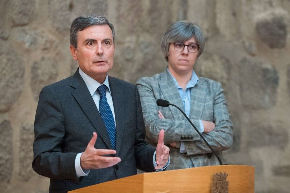 Pedro Saura, acompañado por Leire Iglesias, tras la reunión del Pacto por el Ferrocarril. - JUNTA