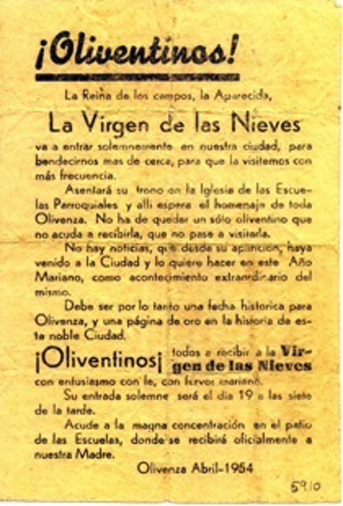 Es por ello que, según consta en el anverso, se animaba a todos los oliventinos a recibirla en el patio de las Escuelas y, de ahí, trasladarla a su capilla, donde estaría por espacio de dos meses, hasta el 13 de junio que se devolvería a su ermita.