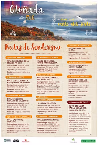 Una programación de rutas senderistas, organizada por Soprodevaje, y que comenzó ya el pasado fin de semana en Barrado con la Ruta del Robledal de la Solana, y continuará el próximo sábado, 5 de noviembre, en Jerte, con la Ruta 'Los Calbotes', que atravesará la Reserva Natural de la Garganta de los Infiernos.