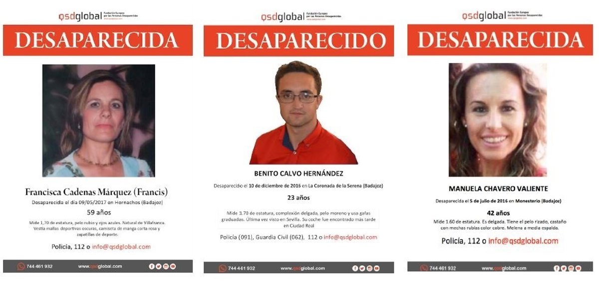 En concreto, a la reunión acudirán familiares de Manuela Chavero, que desapareció en julio de 2016 en Monesterio; de Benito Calvo, del que no se sabe nada desde diciembre de 2016, y de Francisca Cadenas, cuya pista se perdió en mayo de 2017.