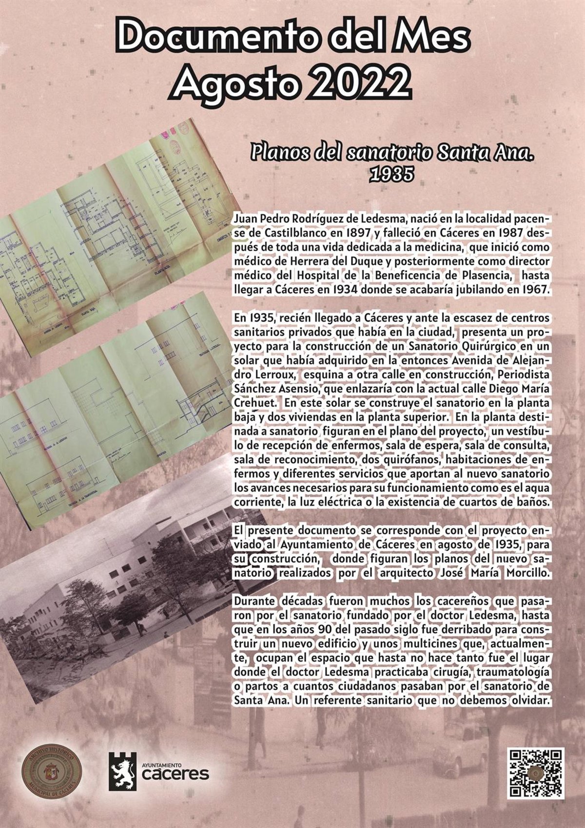 El Palacio de la Isla de Cáceres expone como 'Documento del Mes' de agosto el proyecto presentado al ayuntamiento por el doctor Rodríguez de Ledesma en agosto de 1935 para la construcción del Sanatorio de Santa Ana, donde figuran los planos realizados por el arquitecto José María Morcillo.