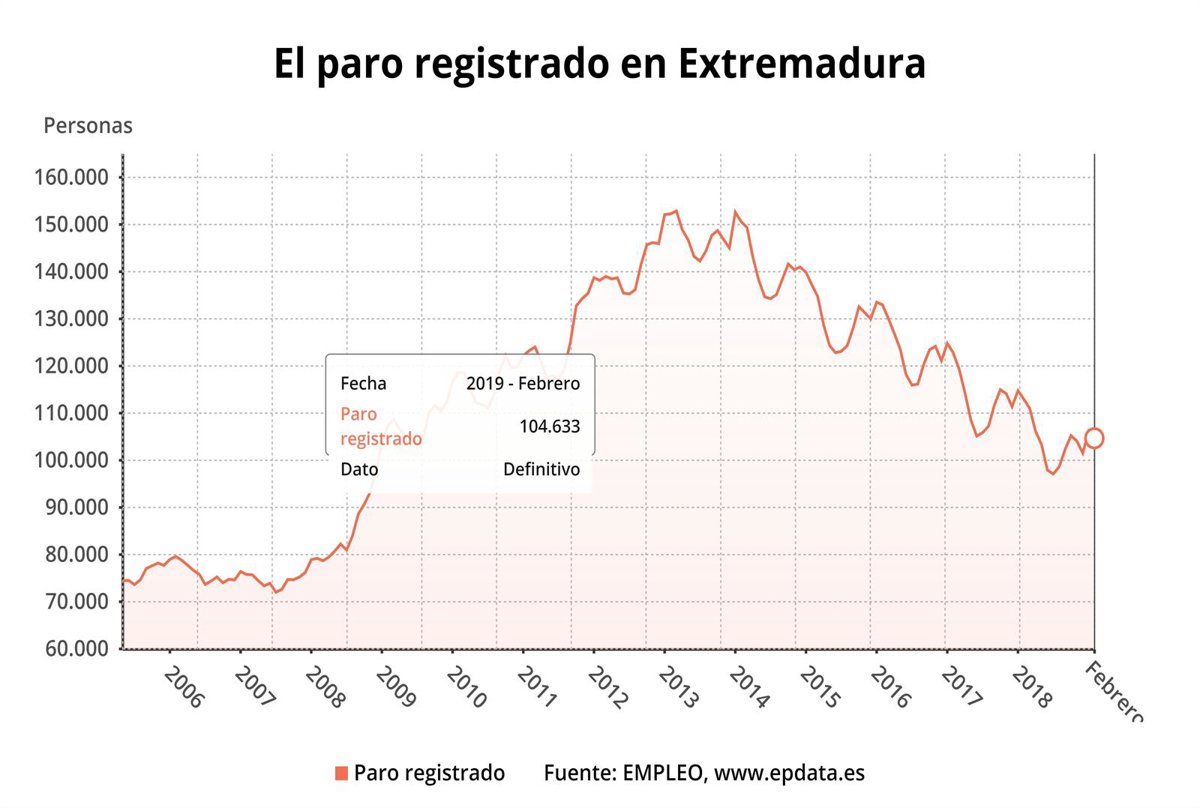 El número de parados registrados en las oficinas de los servicios públicos de empleo (antiguo Inem) en Extremadura ha descendido en 1.534 desempleados en febrero (-1,44%) con respecto al mes anterior y sitúa la cifra total de desempleados en 104.633 personas.