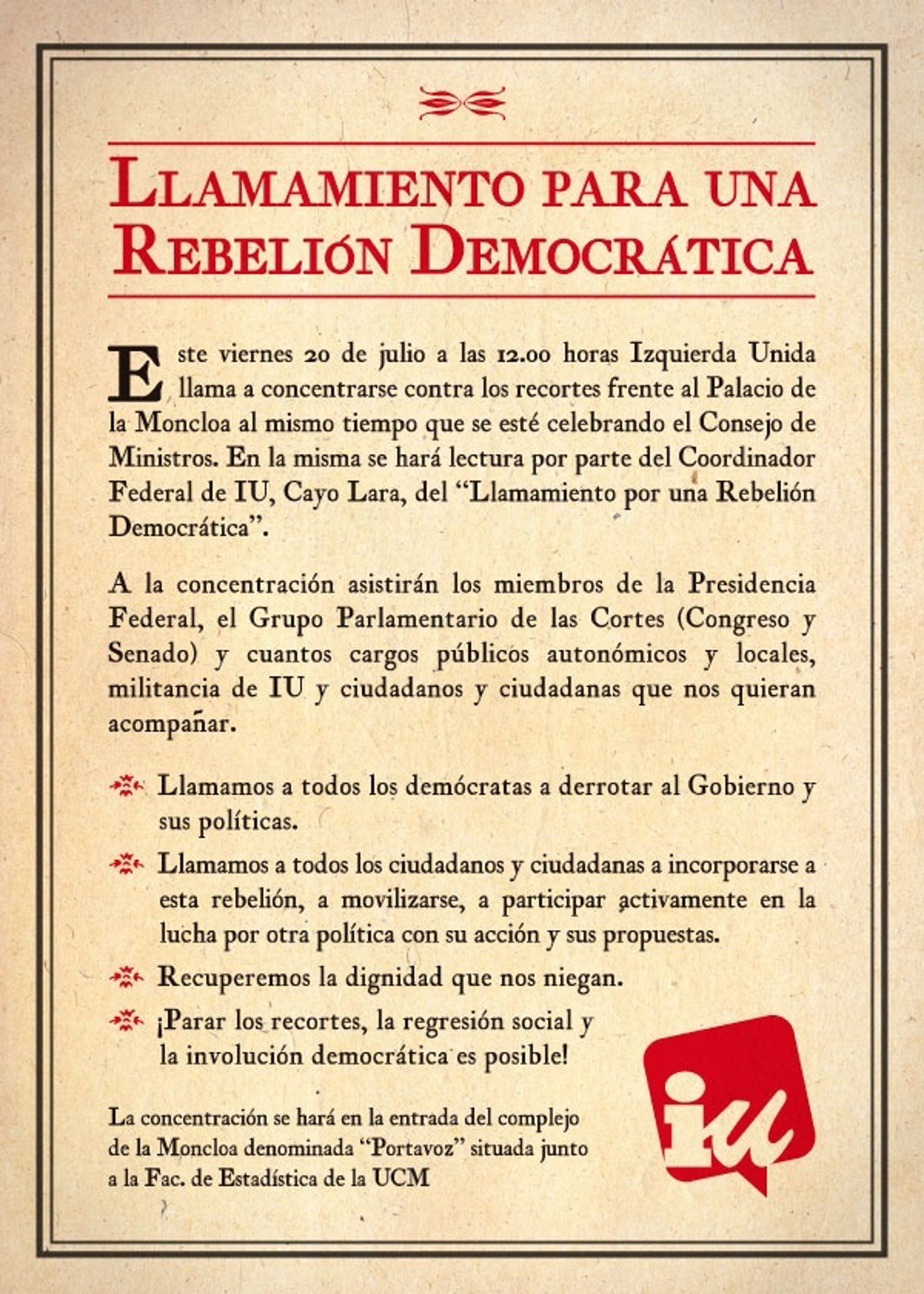 De esta manera, IU Extremadura se unirá al 'Llamamiento por una Rebelión Democrática' lanzado por el coordinador federal de IU, Cayo Lara.