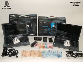 Igualmente, con la pertinente autorización judicial, los agentes procedieron al registro de los paquetes postales enviados, en cuyo interior se encontraron dos ordenadores portátiles sin estrenar.