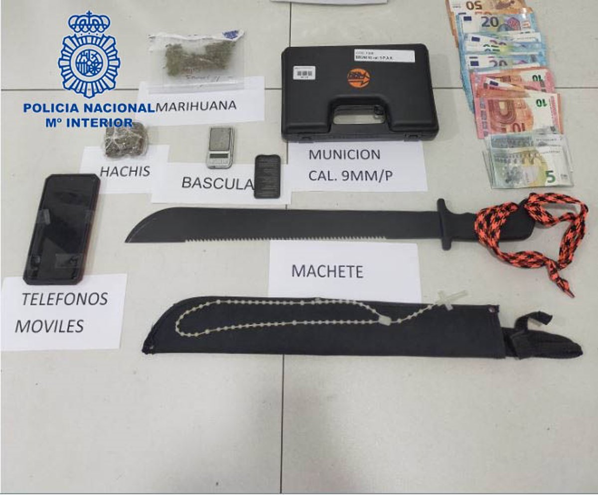 Una vez conseguida la información necesaria, y con la preceptiva autorización Judicial, se realizó un registro domiciliario en la céntrica avenida Hernán Cortes de Cáceres, donde se han intervenido 65 gramos de hachís, 12 gramos de marihuana, la caja de un arma de fuego conteniendo munición, un "machete" de 50 centímetros de hoja, una bascula de precisión, un teléfono móvil, trozos de recortes de plástico para la confección de las dosis de las distintas sustancias, que posteriormente se sacarían a la venta y 705 euros en billetes fraccionados.