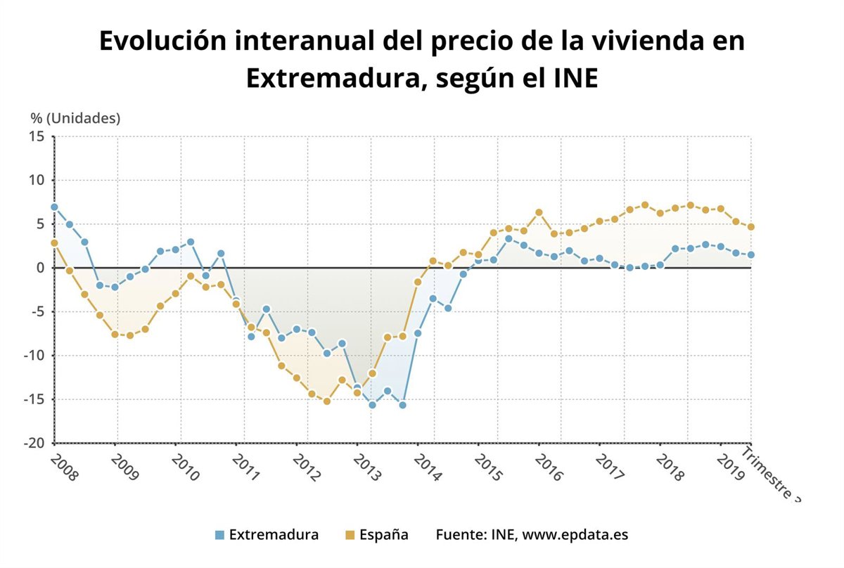 El precio de la vivienda subió en Extremadura un 1,5% en el tercer trimestre en relación al mismo periodo del año anterior, tres veces menos que la media nacional (4,7%), y el incremento más moderado de todas las comunidades, según el Índice de Precios de Vivienda (IPV) del Instituto Nacional de Estadística (INE) publicado este jueves.