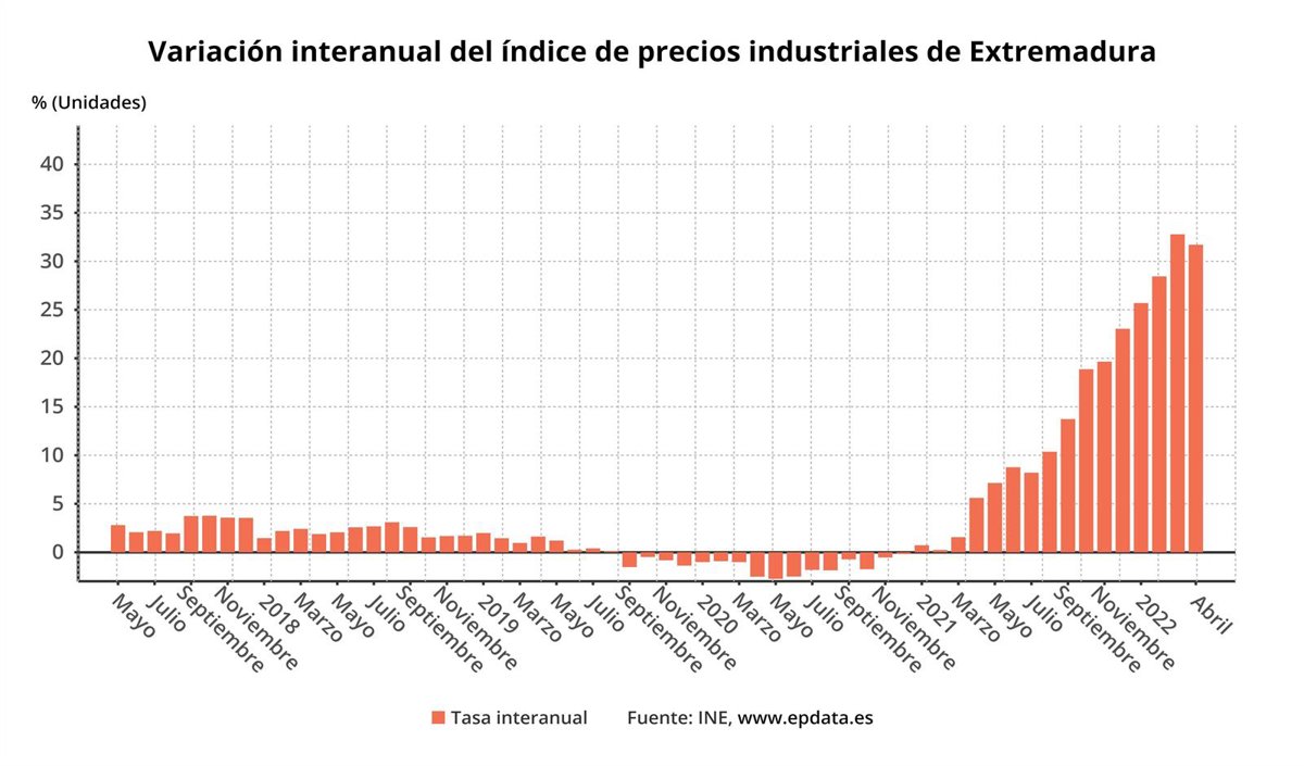El Índice General de Precios Industriales (IPRI) experimenta una tasa de variación anual en Extremadura del 31,7 por ciento, mientras que en comparación con el mes anterior se incrementaron un 1,7 por ciento, según ha informado este miércoles el Instituto Nacional de Estadística (INE).