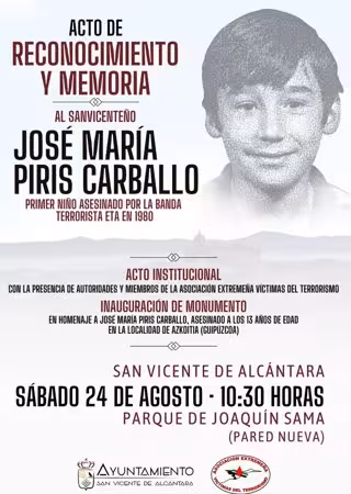 El Ayuntamiento de San Vicente de Alcántara y la Asociación Extremeña de Víctimas del Terrorismo (Asexvite) celebra este sábado 24 de agosto un acto de reconocimiento y memoria a José María Piris Carballo, nacido en esta localidad pacense en 1966.