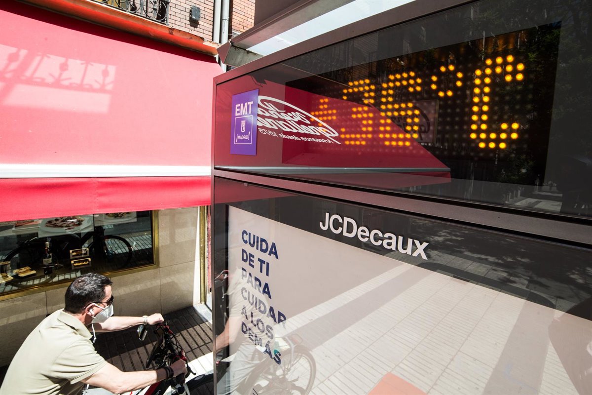 Un hombre pasa en bicicleta junto a un termómetro. - Joaquin Corchero - Europa Press - Archivo