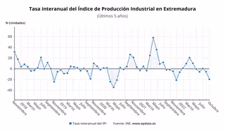 El Índice General de Producción Industrial (IPI) descendió un 19,5 por ciento en octubre en relación al mismo mes de 2021 en Extremadura, la mayor caída de todo el país, donde ha subido una media del 2,2 por ciento, según ha informado este viernes el Instituto Nacional de Estadística (INE).