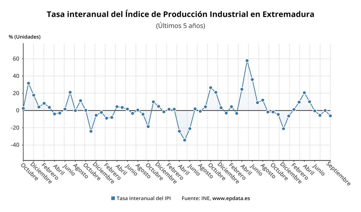 Extremadura se situó el pasado septiembre entre las comunidades que lideraron la caída de la producción industrial en relación al mismo mes del año anterior, con un descenso del 6,2 por ciento, solo dos décimas menos que Asturias y Cantabria, que registraron el peor dato.