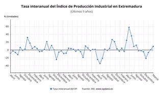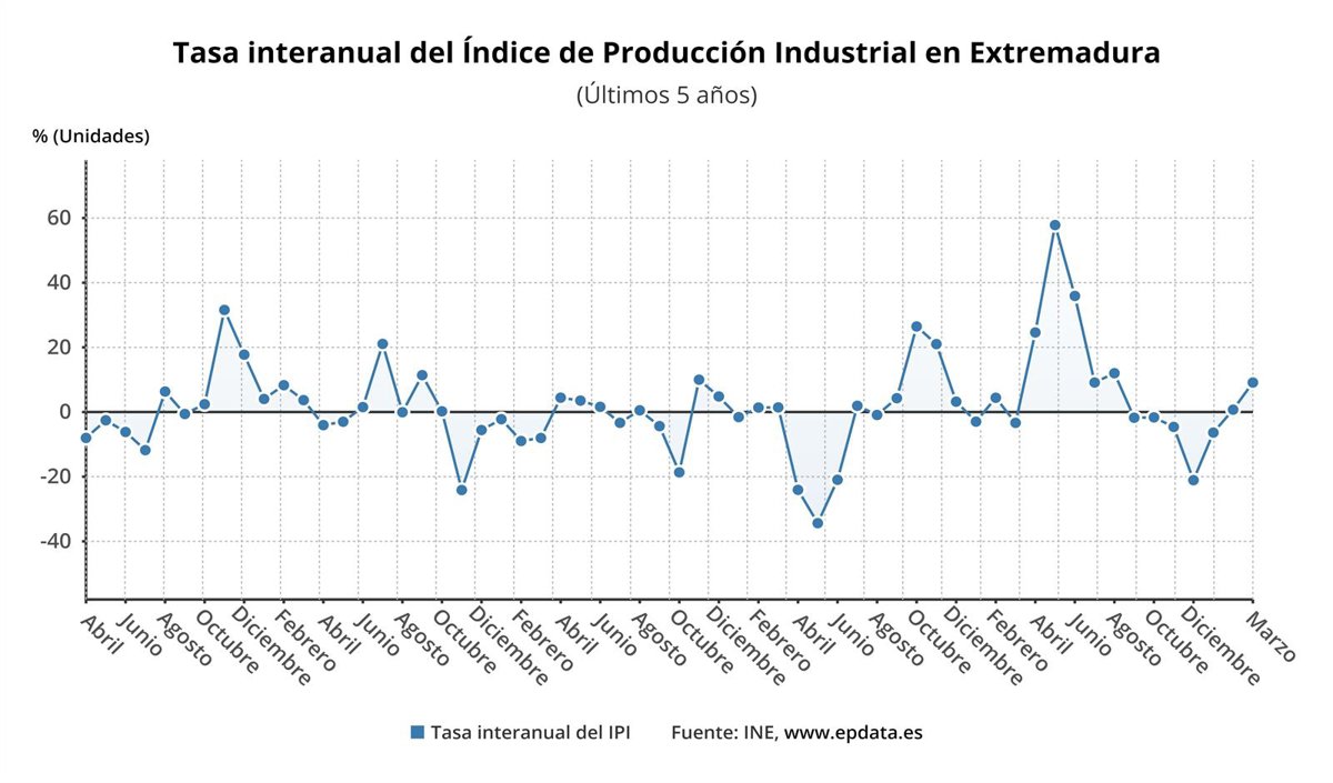 El Índice de Producción Industrial (IPI) ha aumentado un 9,1 por ciento en marzo en Extremadura en comparación con el mismo mes de 2021, lo que supone el segundo mayor incremento por comunidades autónomas (únicamente por detrás del 15,9 por ciento de subida registrado en Baleares).