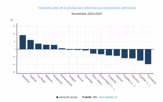 La tasa anual de la producción industrial se ha incrementado en seis comunidades autónomas y ha caído en otras 11. Asturias (+9,2%), Galicia (+6%) y La Rioja (+3,6%) han sido las que han experimentado mayores incrementos, mientras que en el lado opuesto se han situado Cantabria, Castilla-La Mancha y Navarra con retrocesos de un 9,8 por ciento, 7,5 por ciento y un 6 por ciento, respectivamente.