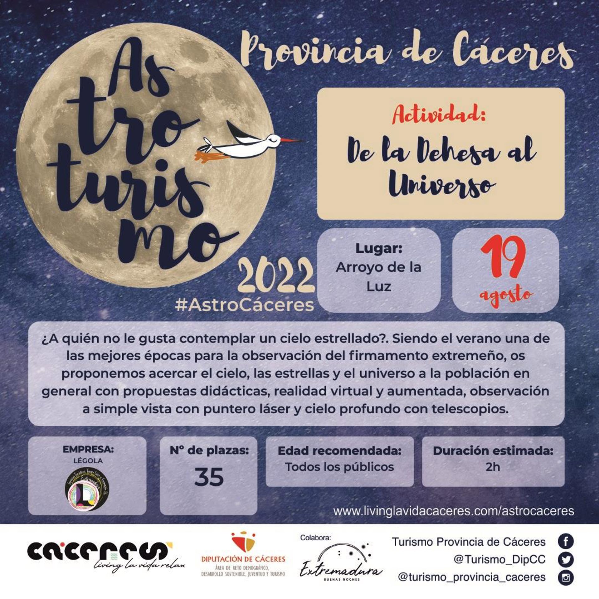 El programa de turismo activo #AstroCáceres, organizado por la institución provincial cacereña, llegará este viernes, 19 de agosto, a Arroyo de la Luz.