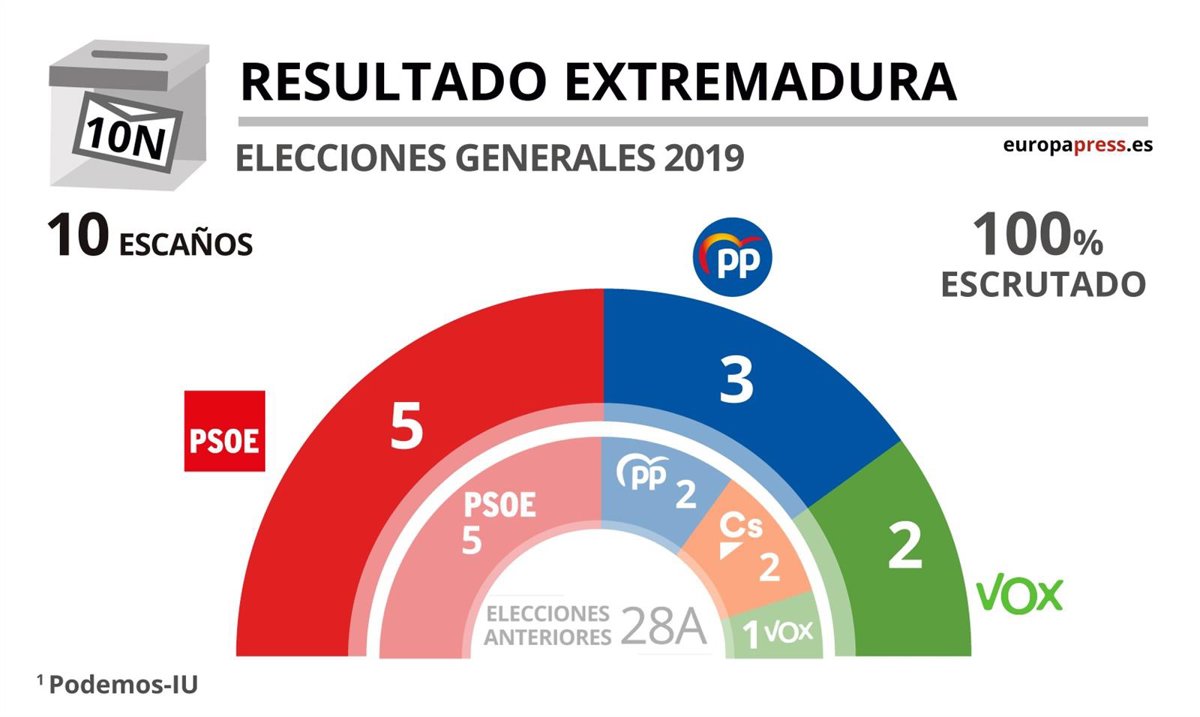 El PSOE ha ganado las elecciones generales de este 10 de noviembre en Extremadura, en las que ha obtenido el 38,34 por ciento de los votos emitidos, y ha mantenido los cinco escaños que consiguió en los comicios de abril, la mitad de los que se reparten en Extremadura.
