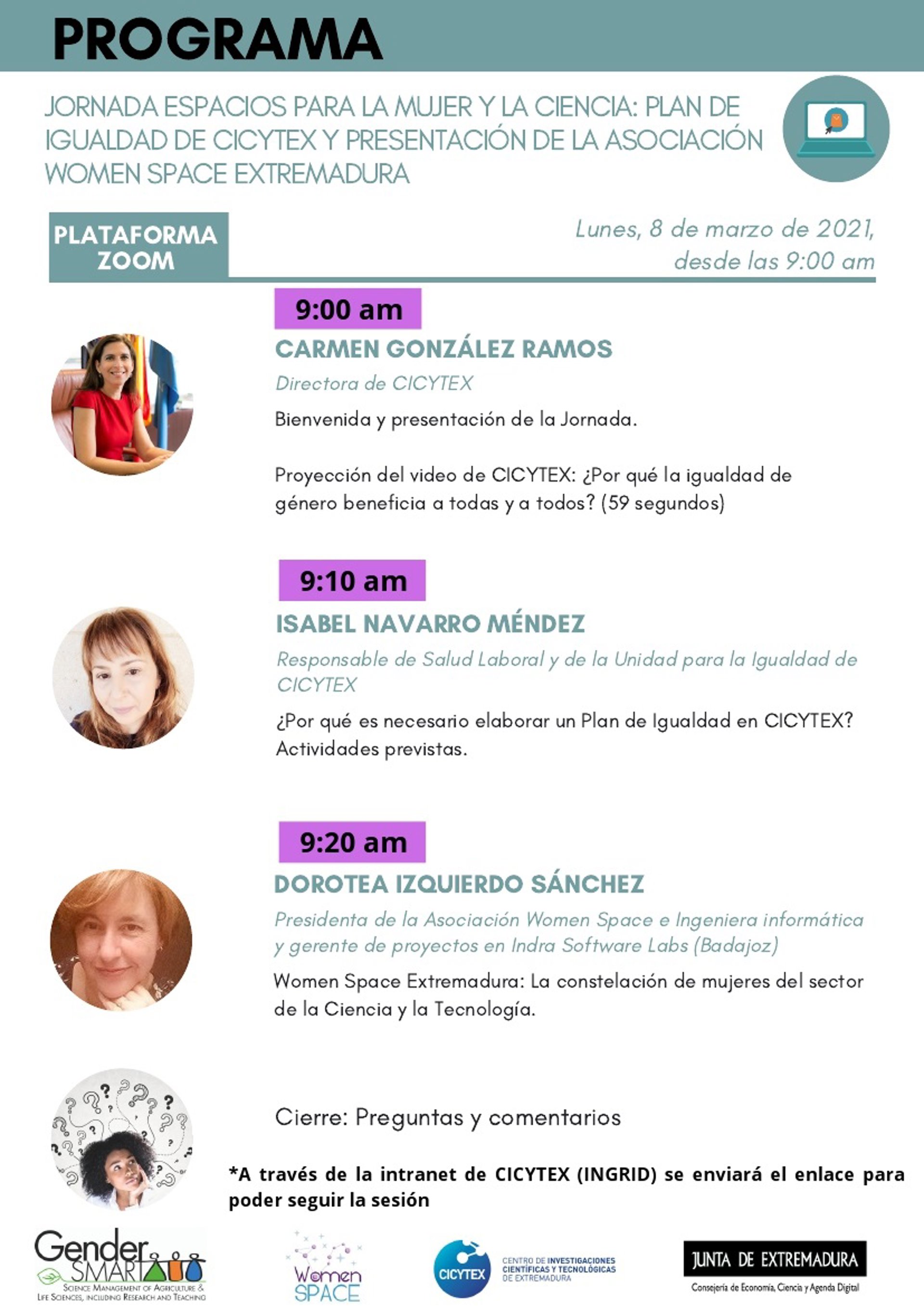 Durante la jornada está prevista la intervención de los representantes de cada uno de los laboratorios que forman parte de la red, en concreto, el coordinador del Smart Open Lab (SOL) de la Escuela Politécnica de Cáceres, Antonio Gordillo; el presidente-fundador de la Asociación FabLab Mérida, Jaime Javier García-Miña; el responsable del Espacio de Prototipado y Creación Digital de la Escuela de Ingenieros Industriales de Badajoz, Jesús Lozano, y el ingeniero investigador en el Laboratorio de Impresión Médica del Centro de Cirugía de Mínima Invasión "Jesús Usón", Juan Carlos Gómez.