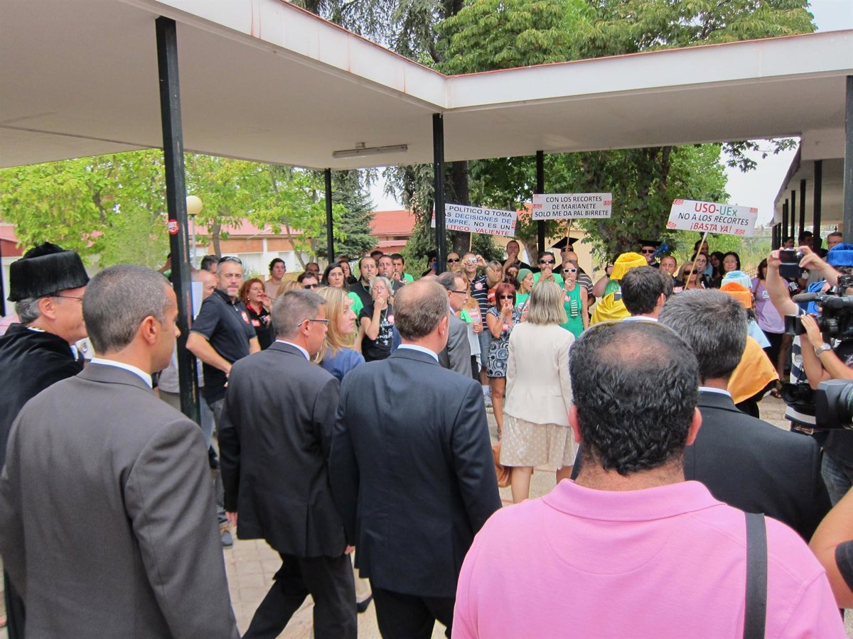 Medio centenar de personas pertenecientes a la Plataforma Sindical y de Asociaciones Profesionales de Empleados Públicos de Extremadura han recibido a las autoridades que asisten en Cáceres a la apertura del curso académico 2012/2013 de la Universidad de Extremadura (UEx) con pitidos y gritos de "fuera, fuera".