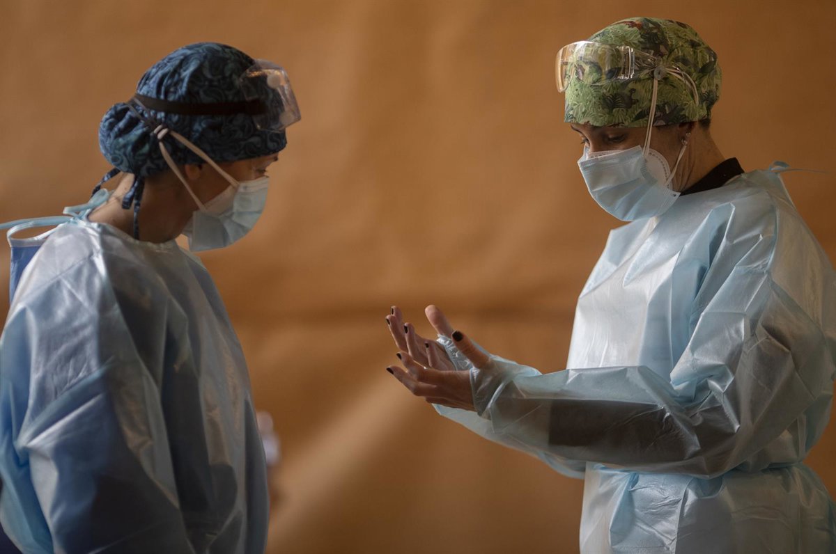 Una trabajadora sanitaria conversa con un compañero en un dispositivo de cribado masivo de antígenos. - Eduardo Parra - Europa Press