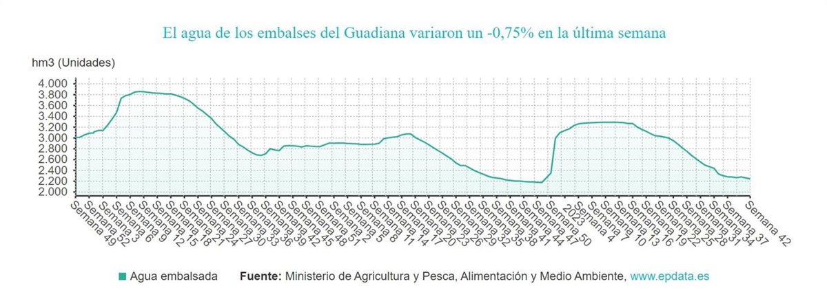 En el conjunto del país, la reserva de agua embalsada ha vuelto a disminuir esta semana, en la que a pesar de las últimas lluvias, ha perdido 407 hectómetros cúbicos, lo que representa un 0,7 por ciento, según informa el Ministerio para la Transición Ecológica y Reto Demográfico, que precisa que en este momento la reserva hídrica guarda 19.368 hectómetros cúbicos y está al 34,6 por ciento de su capacidad total.