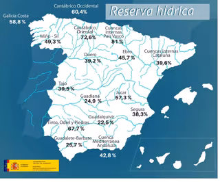 En concreto, la reserva se encuentra al 72,6 por ciento en Cantábrico oriental; al 60,4 por ciento en Cantábrico occidental; al 49,3 por ciento en Miño-Sil; al 58,8 por ciento, en Galicia Costa; al 81 por ciento, en las cuencas internas del País Vasco y Duero 39,2 por ciento. Además, Tinto, Odiel y Piedras está al 67,7 por ciento; Júcar, 57,3 por ciento y el Ebro, al 45,7 por ciento y Cuenca Mediterránea Andaluza al 42,8 por ciento.