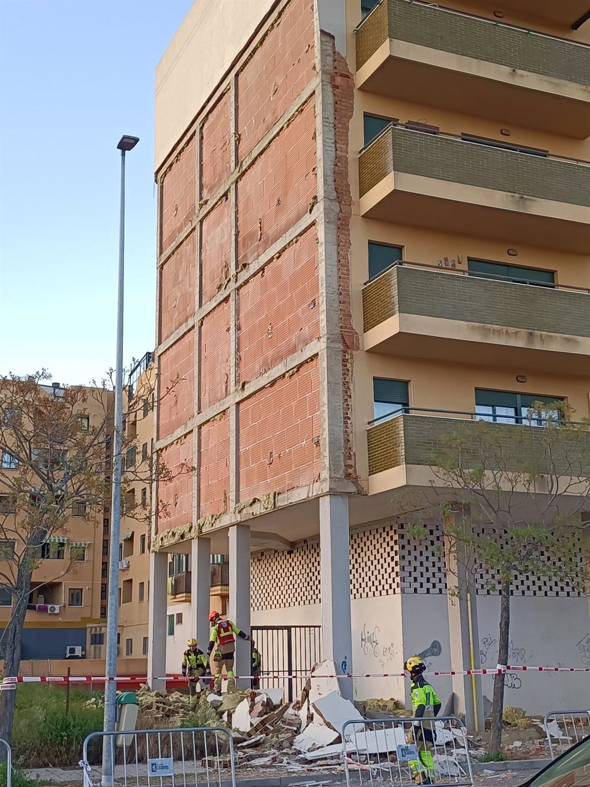 La causa del desplome se desconoce pero todo parece apuntar a que las lluvias caídas estos meses han podido interferir en la adhesión del revestimiento de ladrillo y cemento que se ha venido abajo.