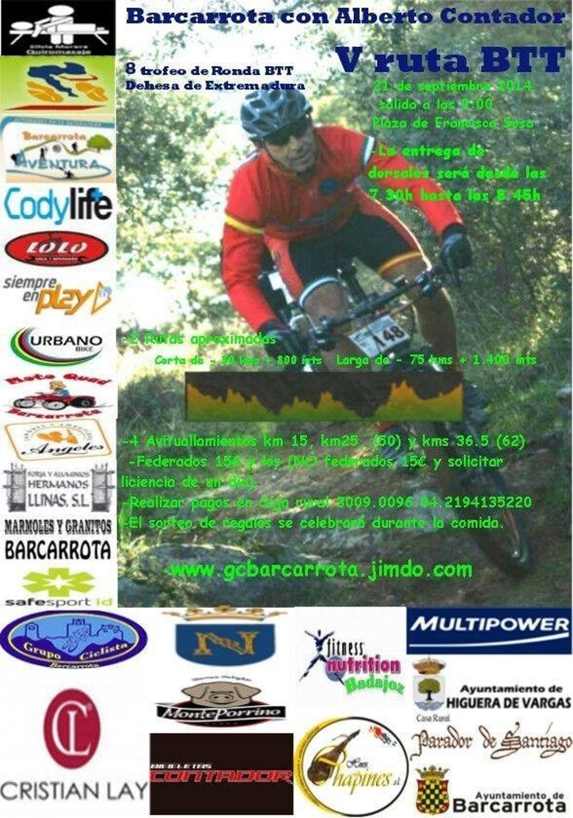 La V Ruta BTT de Barcarrota (Badajoz) rendirá este domingo, día 21, un homenaje a Alberto Contador, reciente campeón de La Vuelta y que tiene sus raíces en esta localidad rayana.