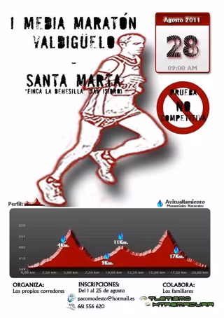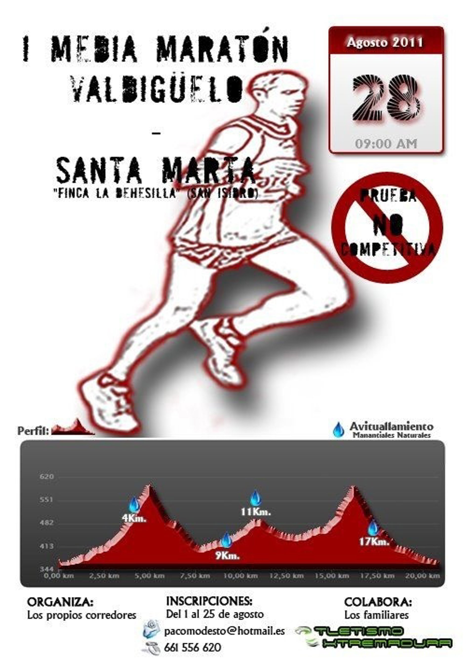 Santa Marta de los Barros (Badajoz) celebrará el 28 de agosto la I Media Maratón Valdigüelo, una carrera en la que se recorrerán los caminos y pistas de la sierra del Valdigüelo, rondando los términos de Santa Marta, La Morera y La Parra.