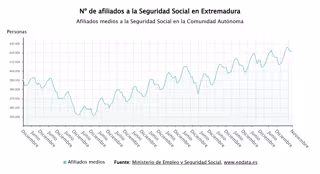 La Seguridad Social en la Comunidad Autónoma de Extremadura ha ganado una media de 5.774 cotizantes en noviembre respecto al mismo mes del año anterior, lo que representa un incremento del 1,39%, hasta sumar 420.737 ocupados, según datos publicados este martes por el Ministerio de Inclusión, Seguridad Social y Migraciones.