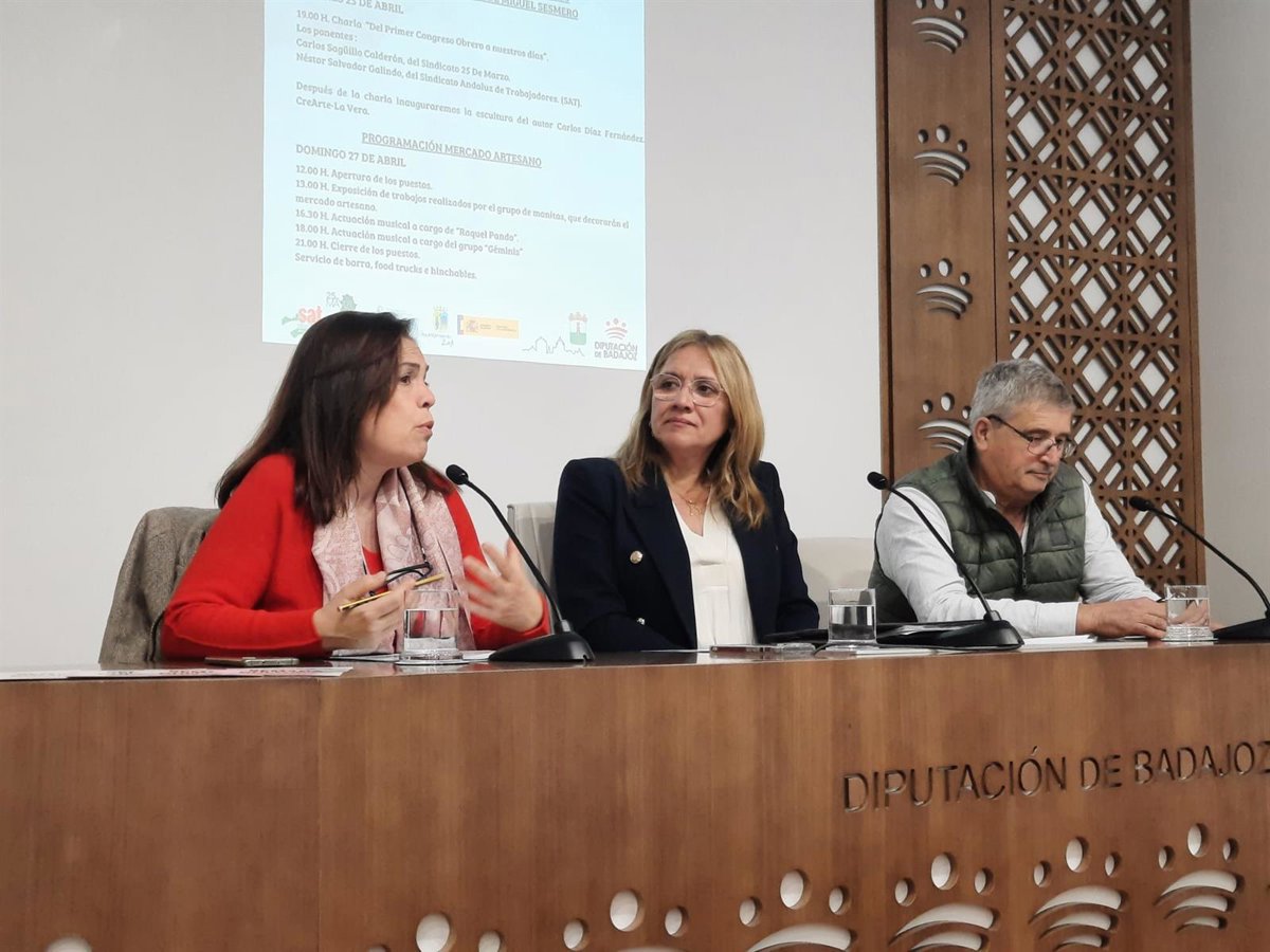 Otra de las actividades será la conmemoración de los congresos obreros en Torre de Miguel Sesmero el viernes 25, con la charla 'Del primer congreso obrero a nuestros días' y la inauguración de una escultura del autor Carlos Díaz Fernández, enmarcada en esta Semana Cultural que ha sido presentada por la diputada provincial de la Diputación de Badajoz, Paqui Silva, la concejala de Cultura de la localidad, Pilar Hernández, y el escritor Rafael Sánchez.