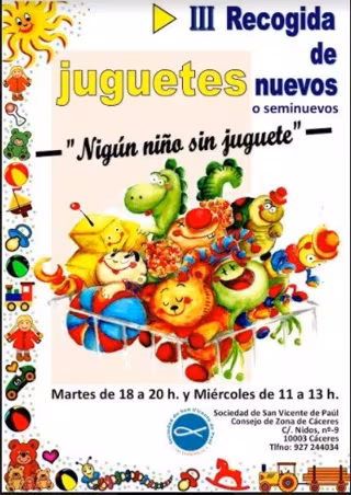 Bajo el lema 'Ningún niño sin juguete', la recogida se realizará los martes en horario de 18,00 a 20,00 horas y los miércoles de 11,00 a 13,00 horas durante el mes de diciembre en el Centro Ozanam, situado en la calle Nidos nº9 de Cáceres.