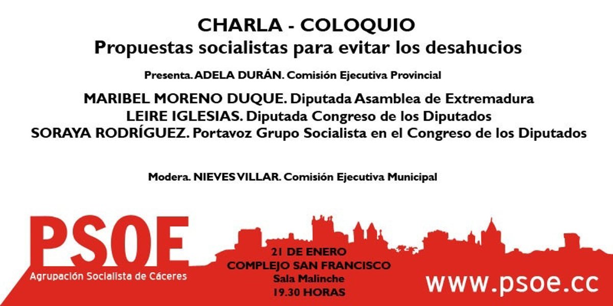 De todo esto se tratará en la Charla-Coloquio titulada 'Propuestas Socialistas para evitar los desahucios', que se celebrará a las 19,30 horas del lunes en la Sala Malinche del Complejo Cultural San Francisco de Cáceres, y en la que, junto a Soraya Rodríguez, participarán el secretario general provincial del PSOE de Cáceres, Miguel Ángel Morales; la diputada nacional Leire Iglesias y el secretario municipal de la Agrupación Socialista de Cáceres, Vicente Valle.