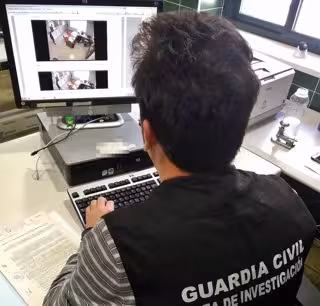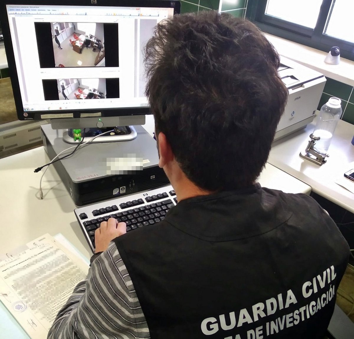 Un agente visiona las imágenes de las cámaras de seguridad de uno de los comercios en los que actuó el detenido. - GUARDIA CIVIL