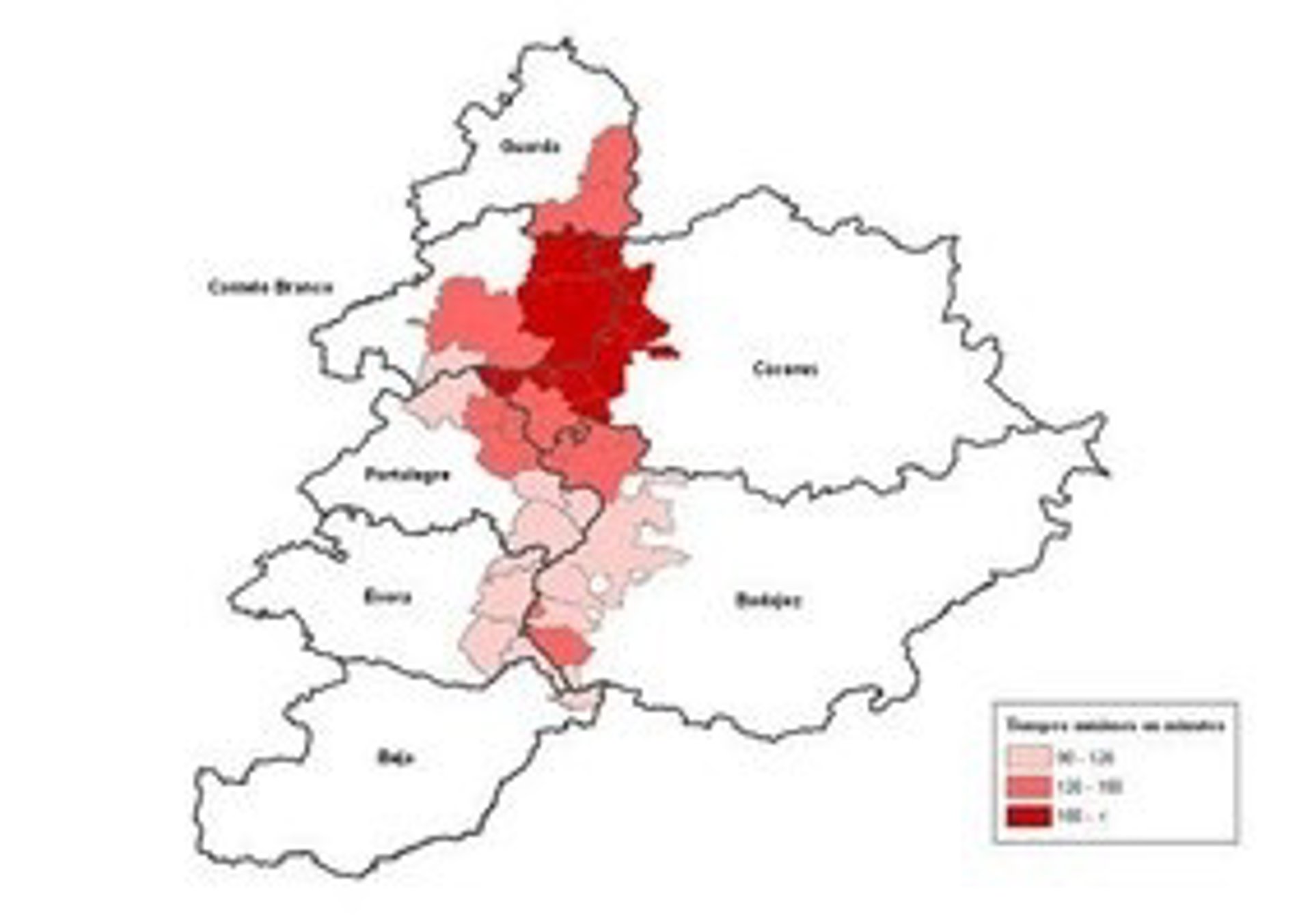 Añade que la tasa de envejecimiento en la UE, España y Portugal se sitúa entorno al 25 por ciento, mientras que en más de la mitad de los municipios analizados presenta porcentajes muy superiores (Idanha-a-Nova 40,6 por ciento; Penamacor 40,4 por ciento; Vila Velha de Rodao 40,1 por ciento; Membrío 38,1 por ciento, o Piedras Albas 34,9 por ciento).