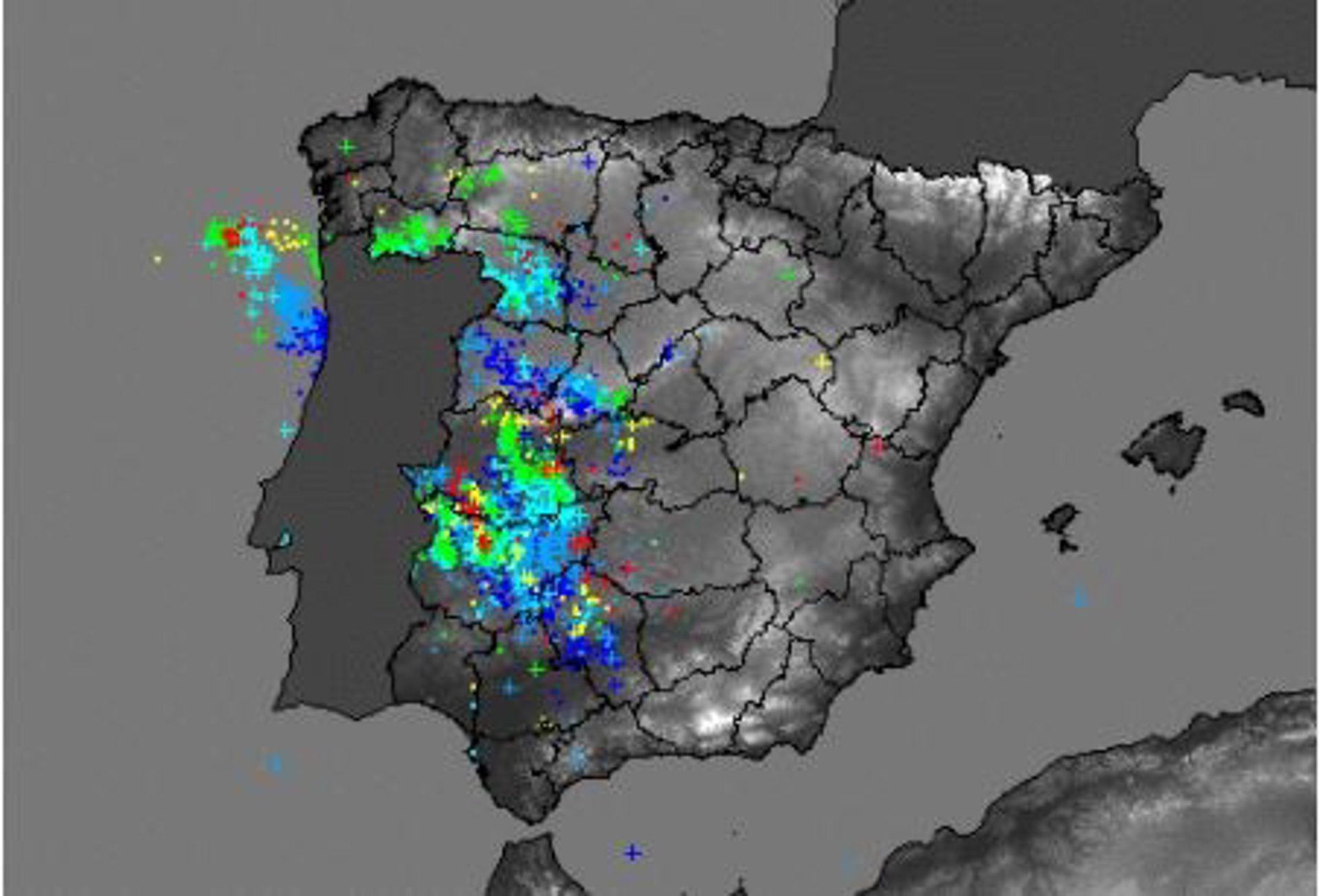 Archivo - Mapa de rayos registrados en la Península ibérica a las 5,00 horas del 13 de junio. - AEMET - Archivo