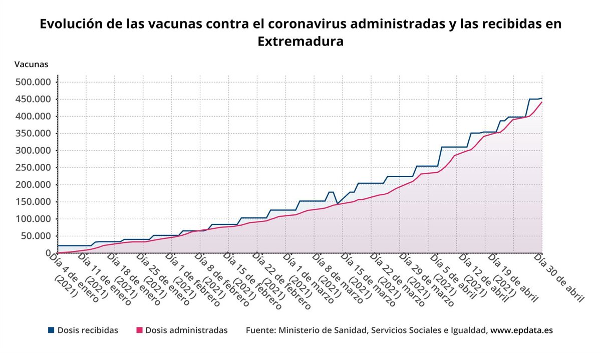 Gráfico de la evolución de las vacunas contra la Covid-19 administradas y recibidas en Extremadura - EPDATA