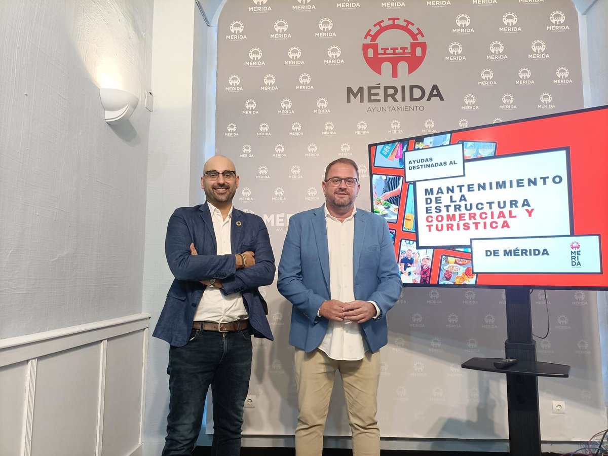 El alcalde de Mérida, Antonio Rodríguez Osuna, presenta las ayudas directas al comercio en el Ayuntamiento de Mérida junto con el delegado de Comercio, José Ángel Calle - EUROPA PRESS