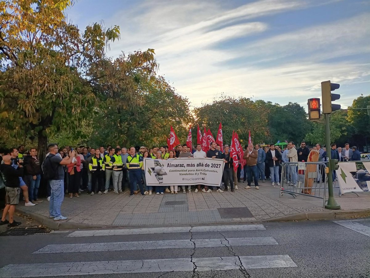 Unos 200 trabajadores de la Central Nuclear de Almaraz (CNA) se han concentrado este miércoles en Cáceres a las puertas del Palacio de Congresos para pedir que no se cierre la planta cacereña y parar la "cuenta atrás" de este proceso que, según está planteado, llevaría a cabo el apagón de un reactor en 2027 y del segundo en 2028.