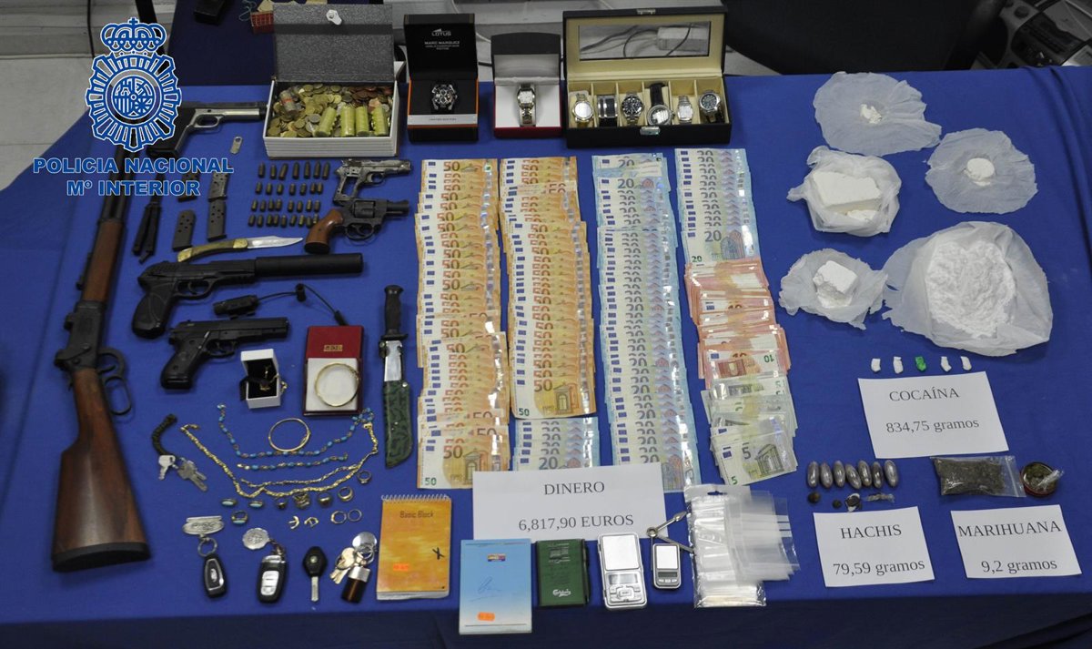 En los registros fueron intervenidos 834,41 gramos de cocaína de gran pureza, 79,59 gramos de hachís, 10 gramos de marihuana, dos pistolas, un revolver, una carabina, dos pistolas de aire comprimido, así como 6.817,90 euros en billetes fraccionados, tres coches de alta gama y una motocicleta.