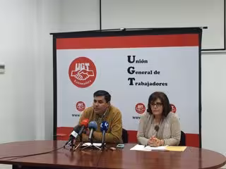 Francisco Capilla ha ofrecido la rueda de prensa acompañado por la secretaria de Empleo y Acción sindical de UGT-Extremadura, Patrocinio Sánchez Escobar.