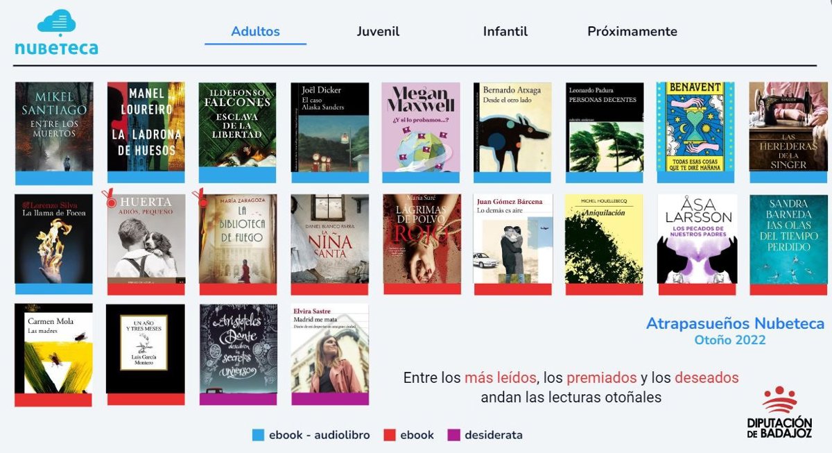 Los lectores adultos de las bibliotecas públicas municipales de la provincia de Badajoz ya tienen a su disposición en el catálogo digital Nubeteca las últimas obras de Carmen Mola, Bernardo Atxaga, Leonardo Padura, Ildefonso Falcones, Mikel Santiago, Lorenzo Silva, Luis García Montero, Jol Dicker o Asa Larsson, entre otros; así como los Premios de Novela Fernando Lara, Máximo Huerta, y EL Premio Azorín de Novela, María Zaragoza.