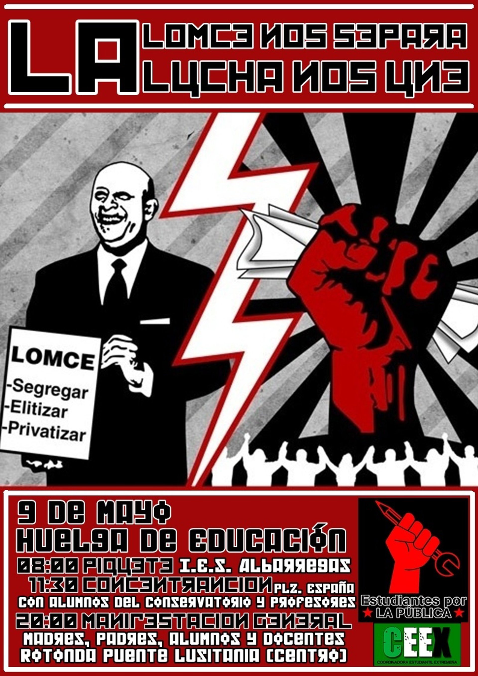Varios colectivos de estudiantes han convocado para este jueves, día 9, varias movilizaciones en distintas localidades de Extremadura en rechazo a la Ley Orgánica para la Mejora de la Calidad Educativa (Lomce) con motivo de la jornada de huelga en el Sector de la Educación.