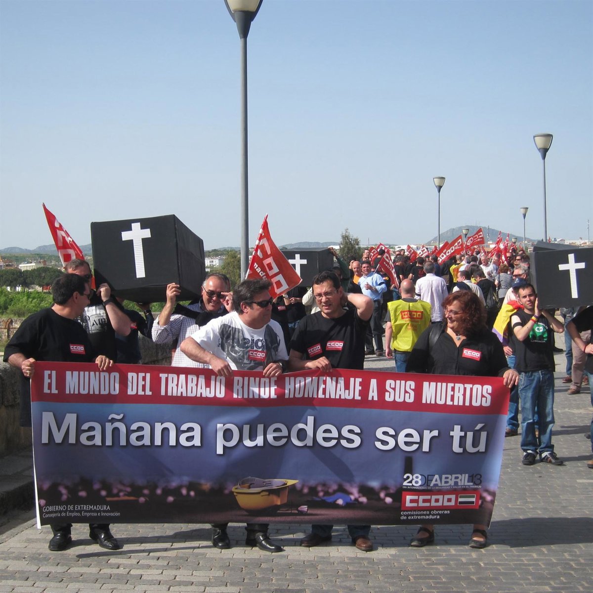 Veinticinco ataúdes han recorrido en este viernes las calles de Mérida, en una manifestación convocada por el sindicato CCOO, en recuerdo a los 25 fallecidos por accidente laboral durante el pasado 2012 en la región extremeña.