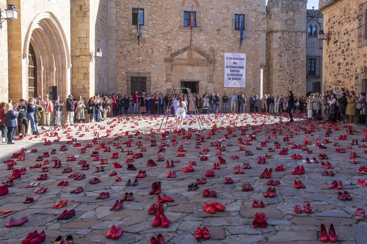 Testimonios de diversas mujeres, entre ellas alguna víctima de la violencia de género, y una plaza de Santa María de Cáceres repleta de zapatos rojos han sido la forma elegida por la Diputación de Cáceres y los municipios de la provincia para conmemorar el 25N, Día Internacional de la Eliminación de la Violencia contra las Mujeres, y reafirmar su compromiso en la lucha contra estas lacra social, que se ha cobrado ya 1.236 víctimas desde el año 2003.