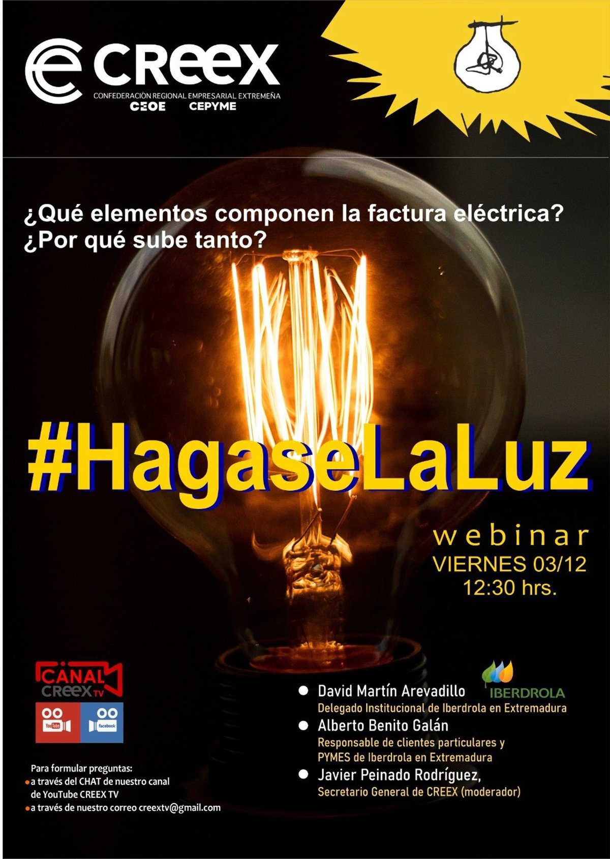 Bajo el título #HagaseLaLuz, la sesión se difundirá a partir de las 12,30 horas a través de YouTube en el canal Creex TV, redes sociales y la web de la confederación. Además, se pueden plantear dudas en el chat de la emisión o a través de correo electrónico.