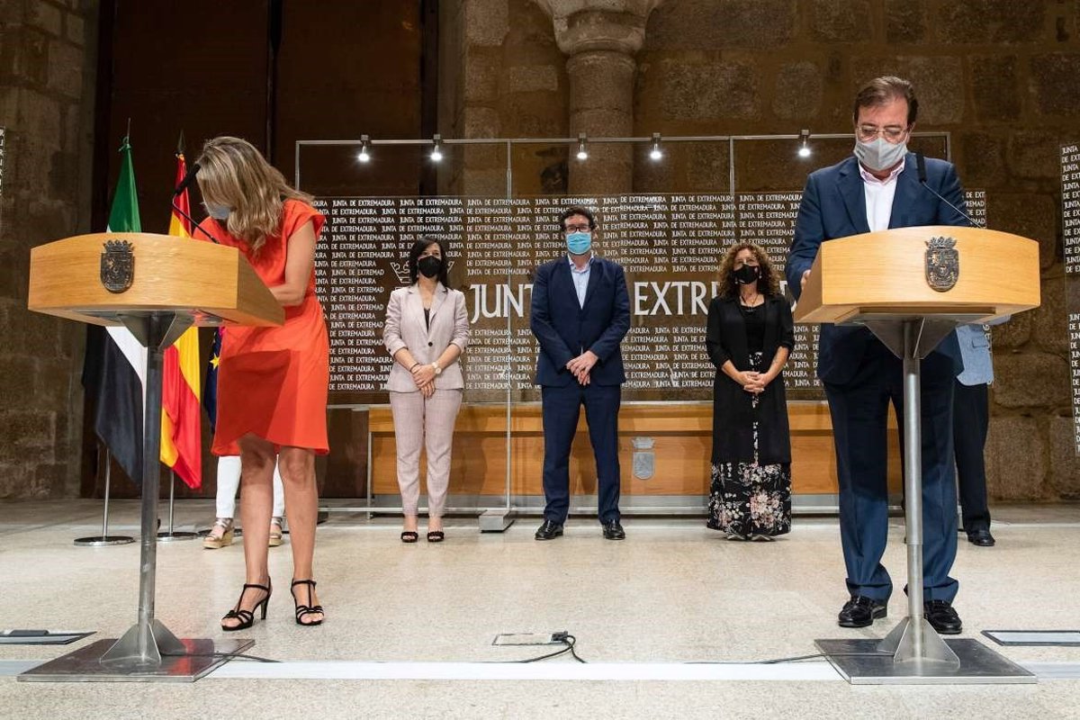 La vicepresidenta tercera y ministra de Trabajo, Yolanda Díaz, y el presidente de la Junta, Guillermo Fernández Vara, han suscrito este miércoles el protocolo por el que Extremadura recibirá 15 millones para combatir el desempleo juvenil, en el marco de su Plan de Empleo Joven 2021-2022, que cuenta con una dotación total de 80 millones de euros.